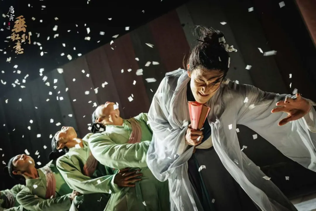 舞剧中巧妙融入了“饮酒”“醉舞”等元素,通过舞者的肢体语言,表现唐寅“酒醒只在花前坐,酒醉还来花下眠”的生活状态。酒,不仅是道具,更是理解“唐寅”内心世界的重要媒介。