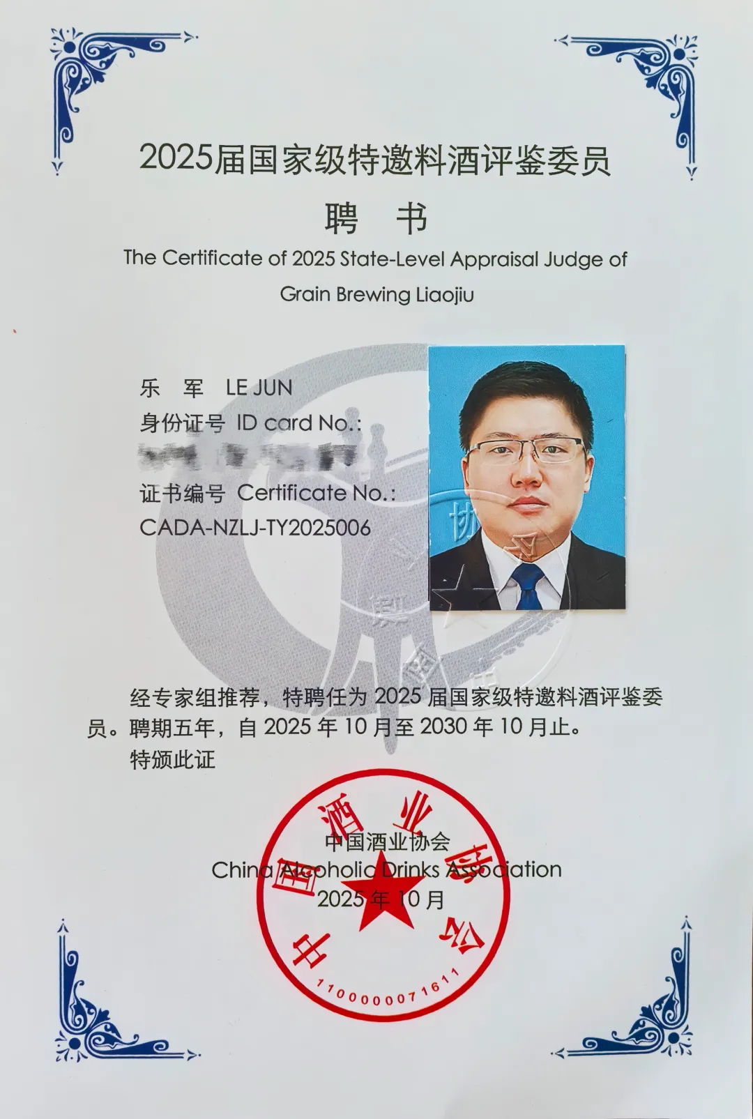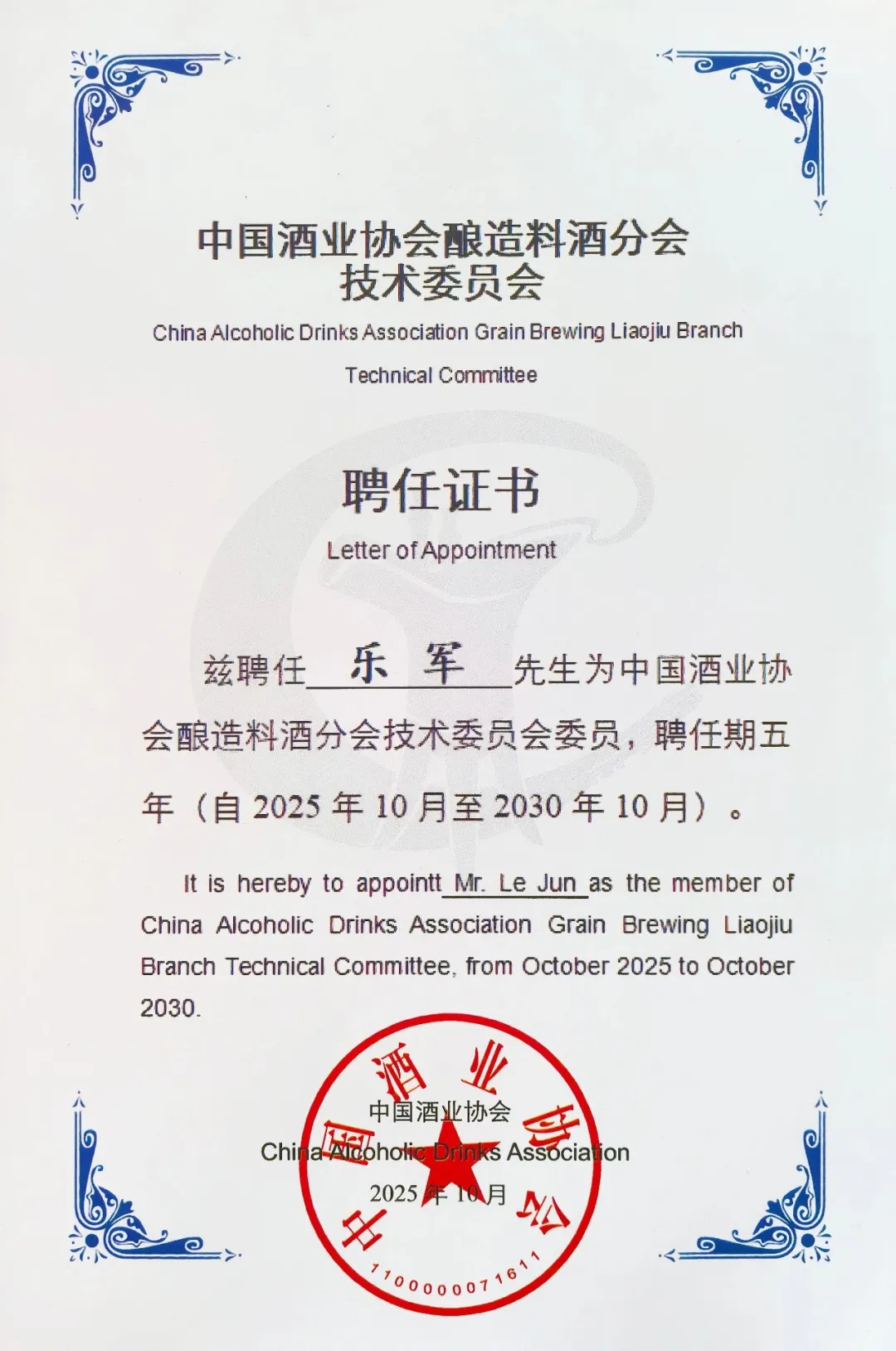乐军被聘为“2025届中国酒业协会酿造料酒分会技术委员会”委员