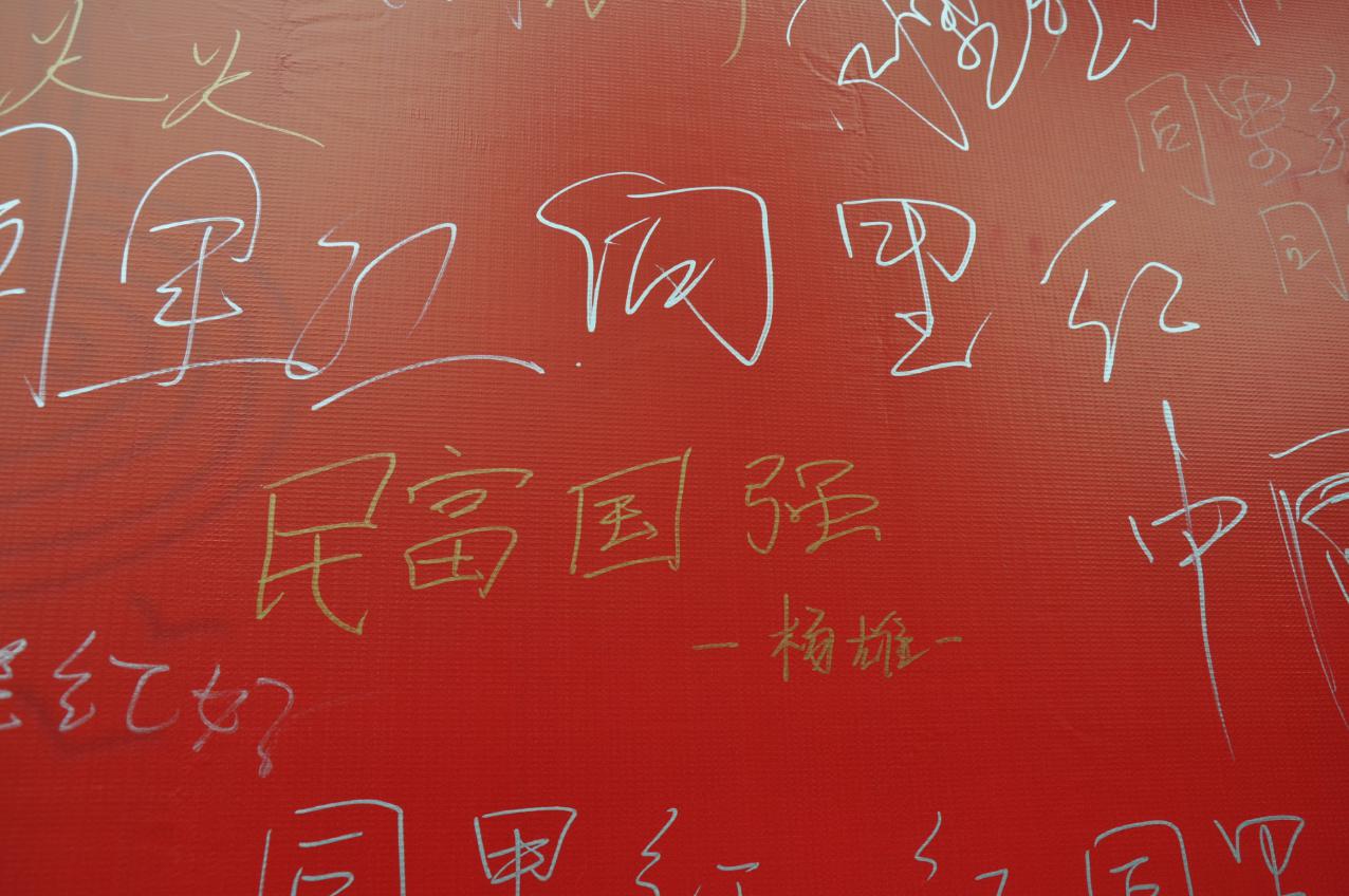 表白墙上,游客们用手中的笔表达着心中对祖国真挚美好的祝福,“我爱你,中国”、“少年强则中国强”,一笔一划都那么清晰,印刻在心底,小小的签名墙上写满了大家对祖国的热爱,无数个一笔一划,构成这密密麻麻的对祖国、对同里、对同里红黄酒的表白之墙。